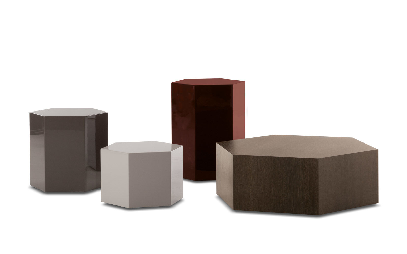 Geometric table set featuring hexagonal forms in matte resin finishes—dark grey, light grey, deep red, and warm brown. Each piece rests on a concealed wooden base, blending sculptural minimalism with subtle natural warmth.