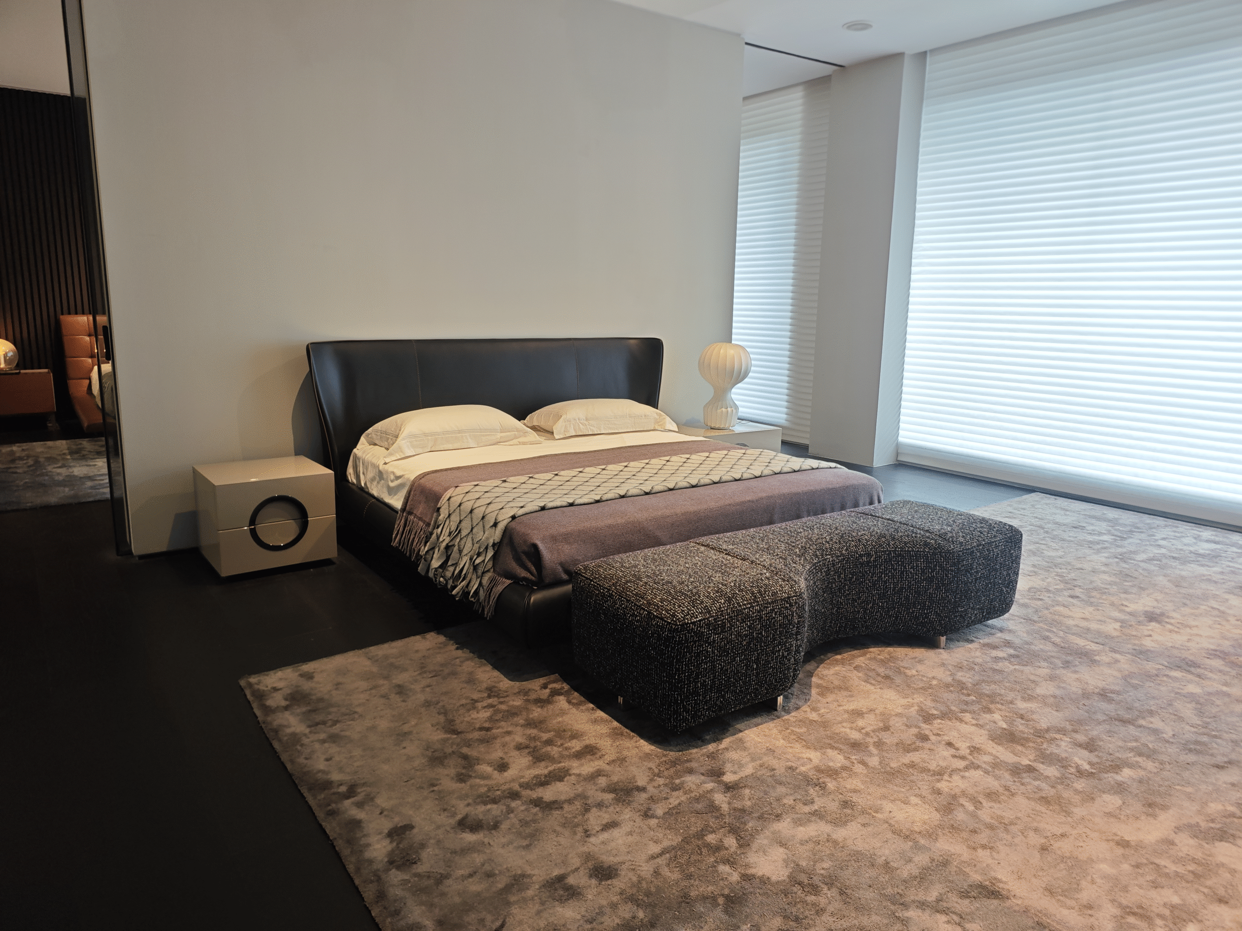 Sophisticated bed design featuring a dark upholstered headboard paired with crisp white bedding and a deep-toned blanket for striking contrast. The curved bench at the foot adds sculptural elegance, while the minimalist nightstand with circular detailing introduces subtle visual interest. Framed by large windows and a soft area rug, the space balances rich textures and neutral tones to create a refined, contemporary atmosphere.