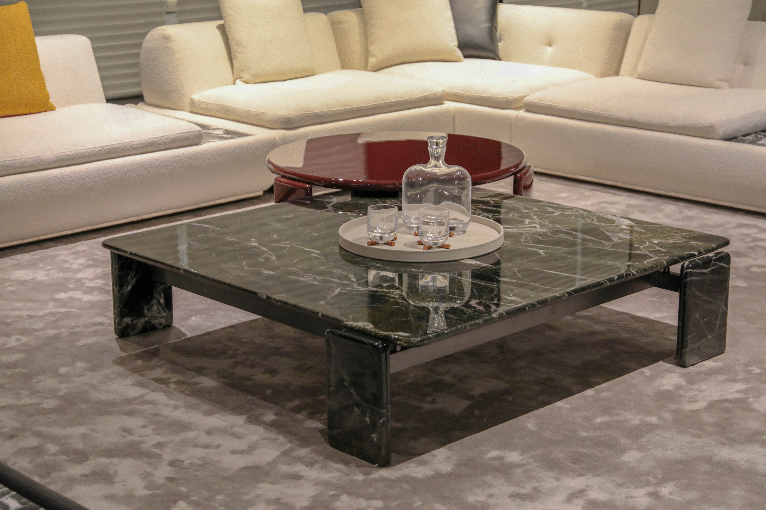 Large square coffee table crafted from black marble with striking white veining, offering a luxurious and timeless surface. The base is a solid block-style structure in matching marble, ensuring visual continuity and robust support within refined living spaces.