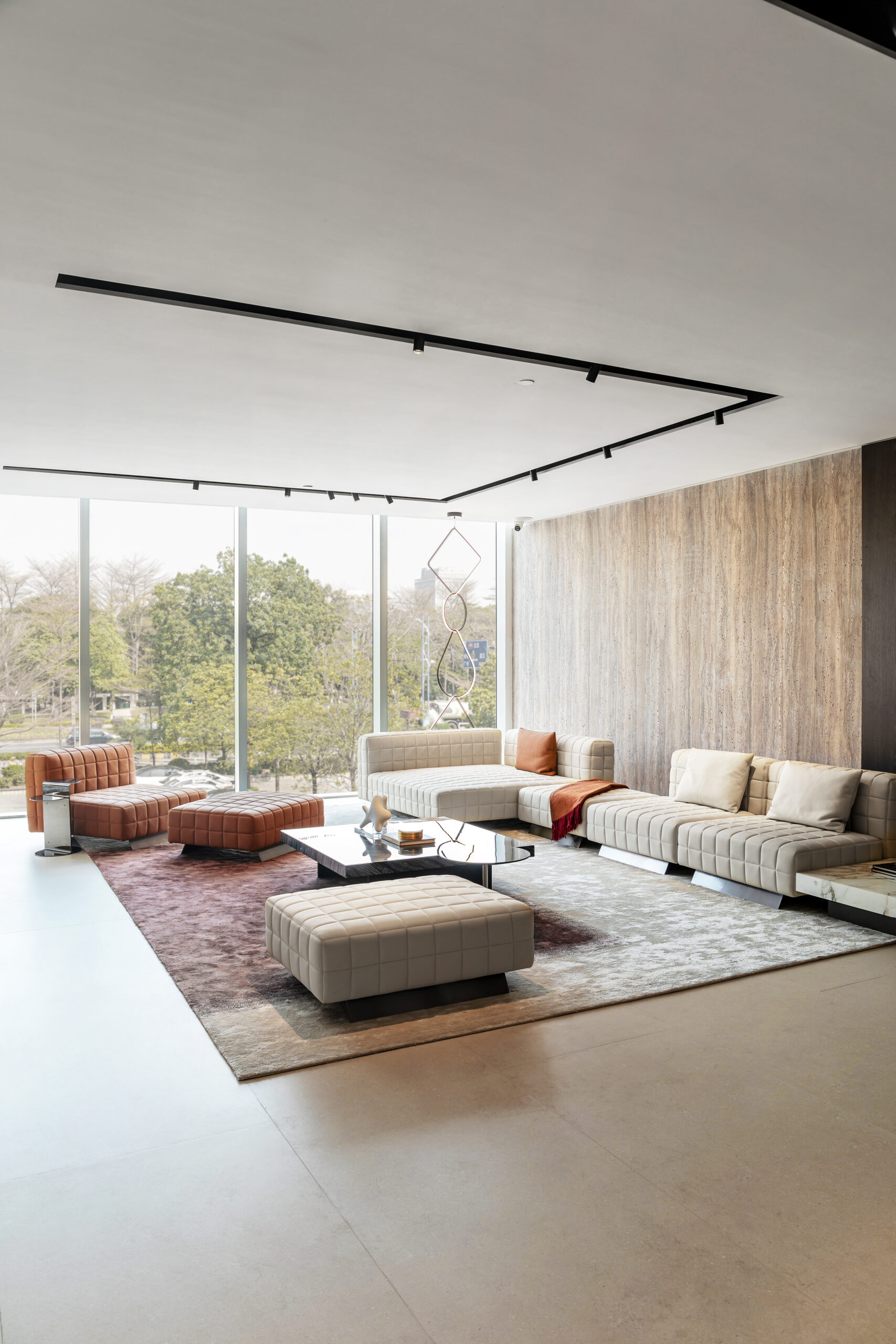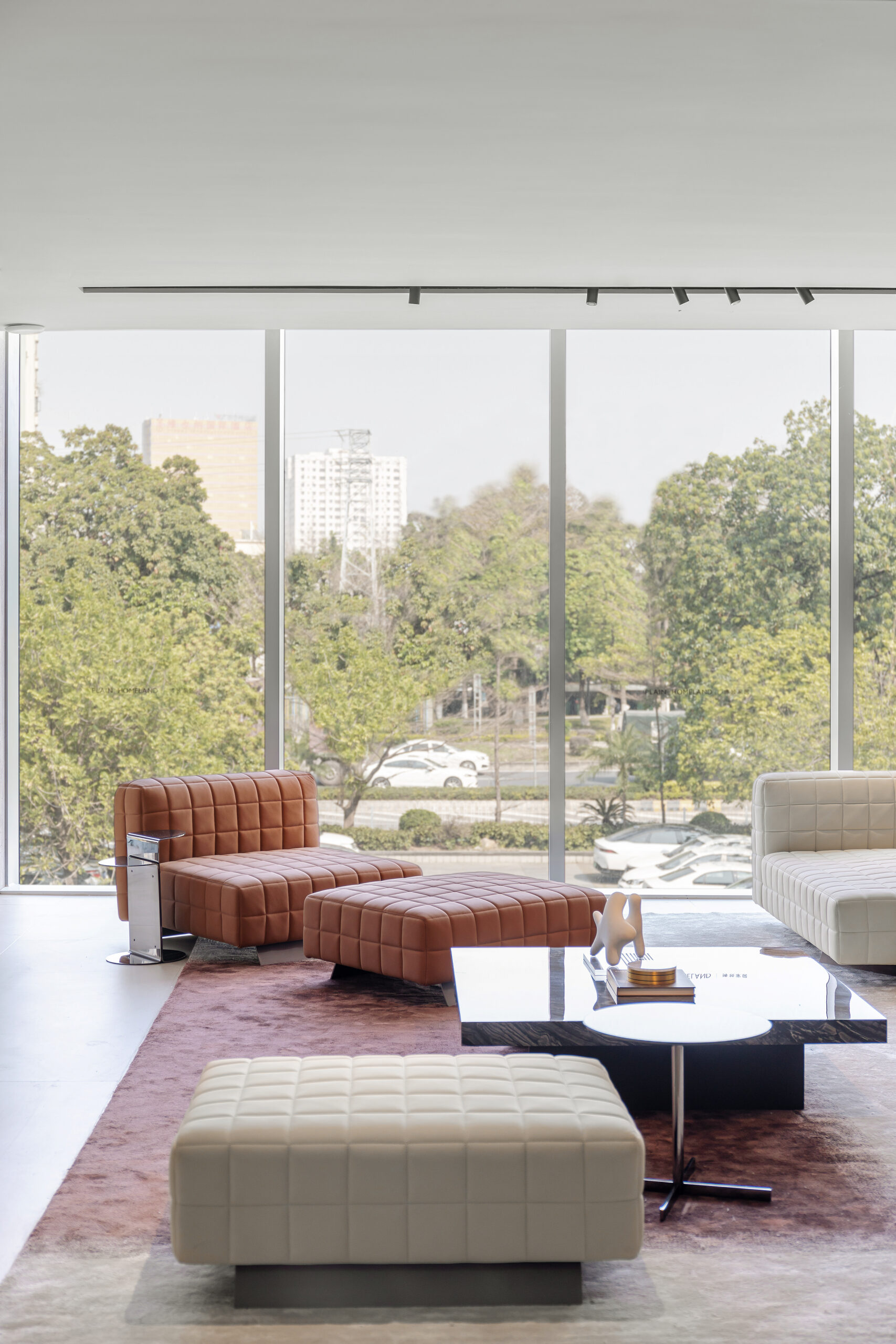 Elegant modular sectional sofa in soft upholstery with quilted detailing and rich wooden bases. Comprising four armless chairs and a right-arm chaise lounge, it offers customizable comfort and a refined, contemporary look—perfect for versatile living spaces.