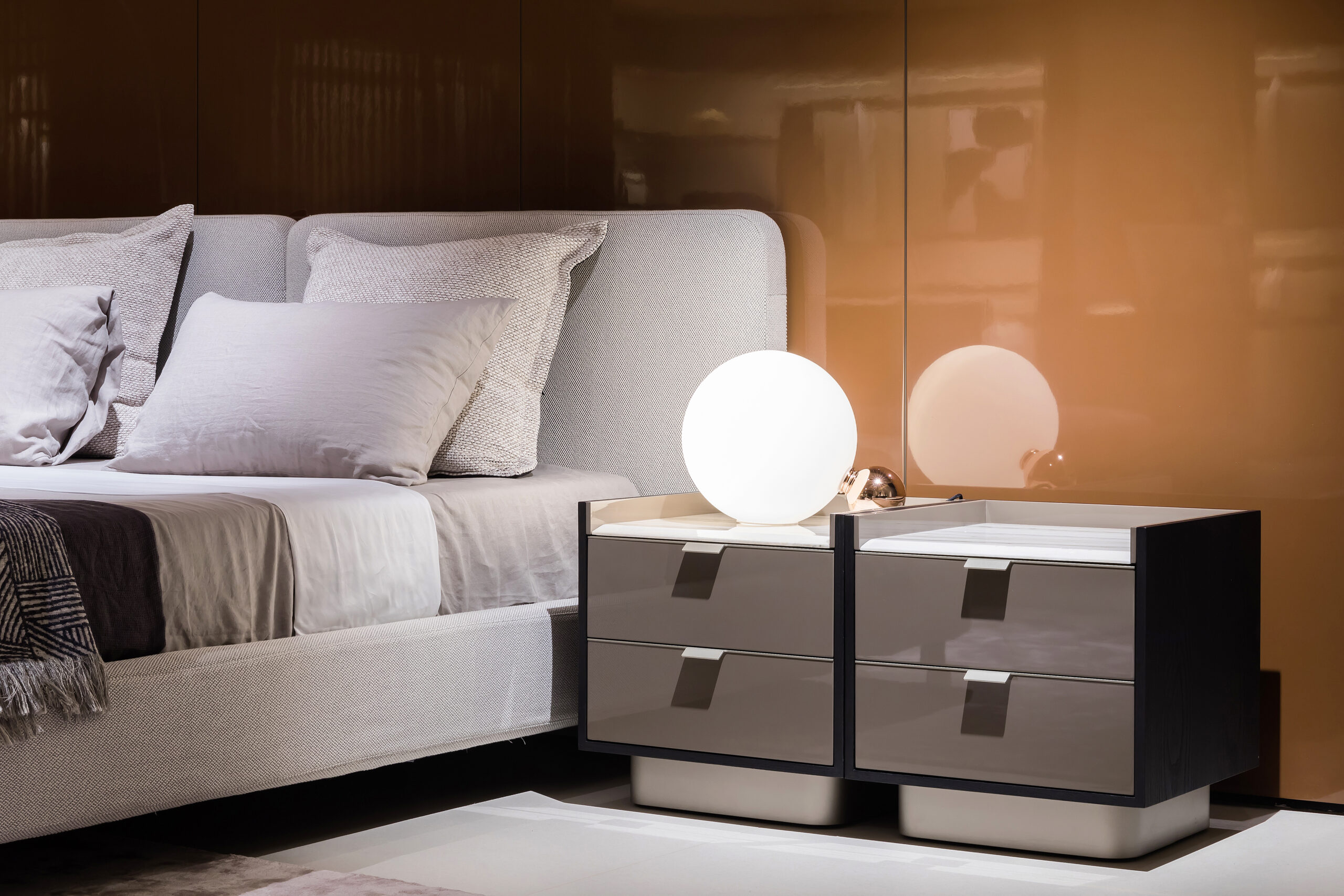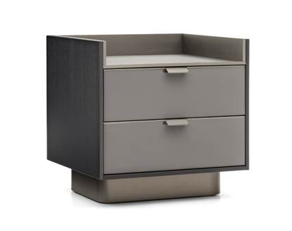 Rectangular chest of drawers in matte gray lacquer with clean, linear contours. Features two spacious drawers with minimalist metal pulls and a raised-edge top forming a shallow tray. Supported by a recessed dark wood base, offering subtle contrast and grounded elegance for modern interiors.
