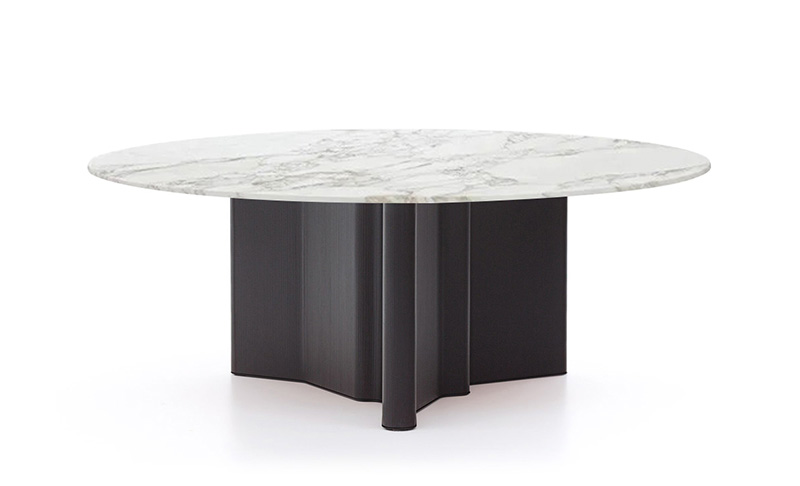 Round table with a white marble top, smooth and patterned with soft gray veining for a refined look.