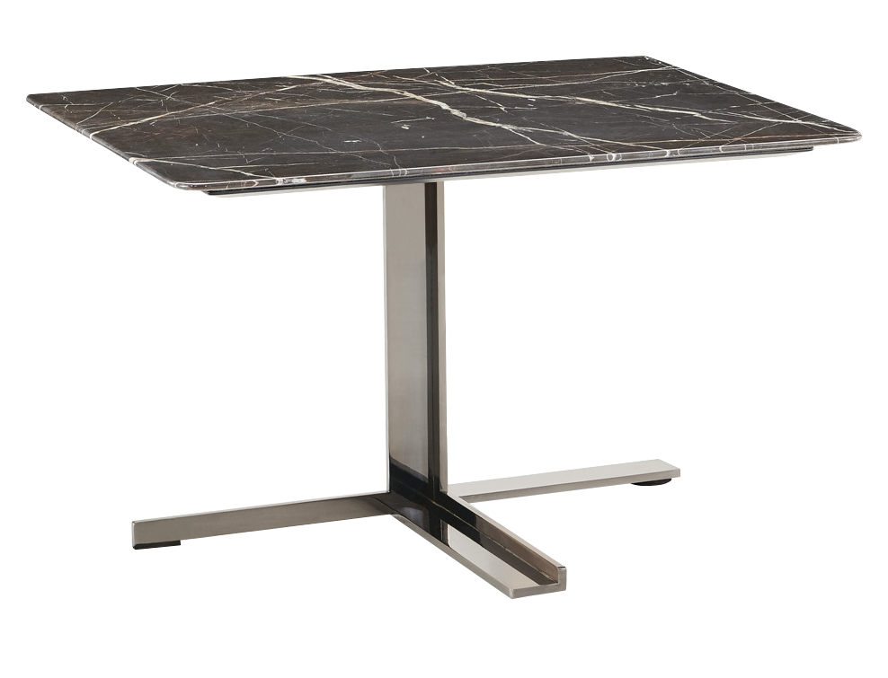Rectangular center table with a dark marble top featuring striking white veining. Supported by a sleek metal pedestal with a T-shaped base, it offers a bold, contemporary silhouette with refined contrast.