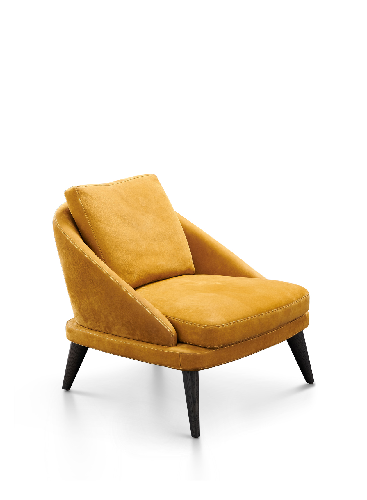 Modern leisure chair upholstered in soft mustard yellow fabric, offering a warm and inviting tone. The seat and backrest are generously cushioned for comfort, while the slightly angled black legs provide stability and a sleek contrast. Its clean lines and cozy texture make it a stylish addition to contemporary living spaces.