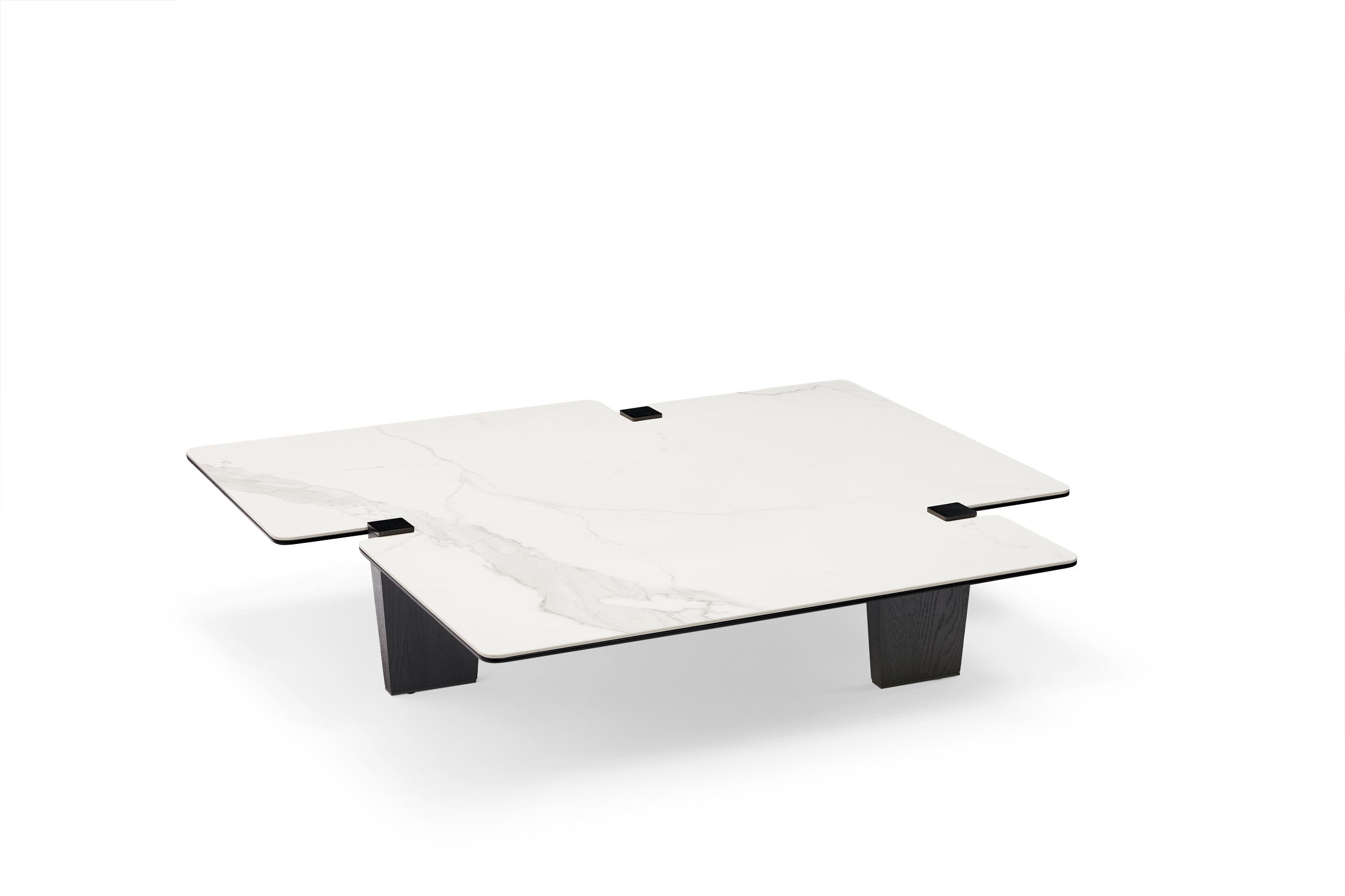 Rectangular center table with a white marble top featuring soft grey veining, paired with sculpted black wooden legs. The cut-out corner design adds a modern edge, blending refined materials with architectural detail.