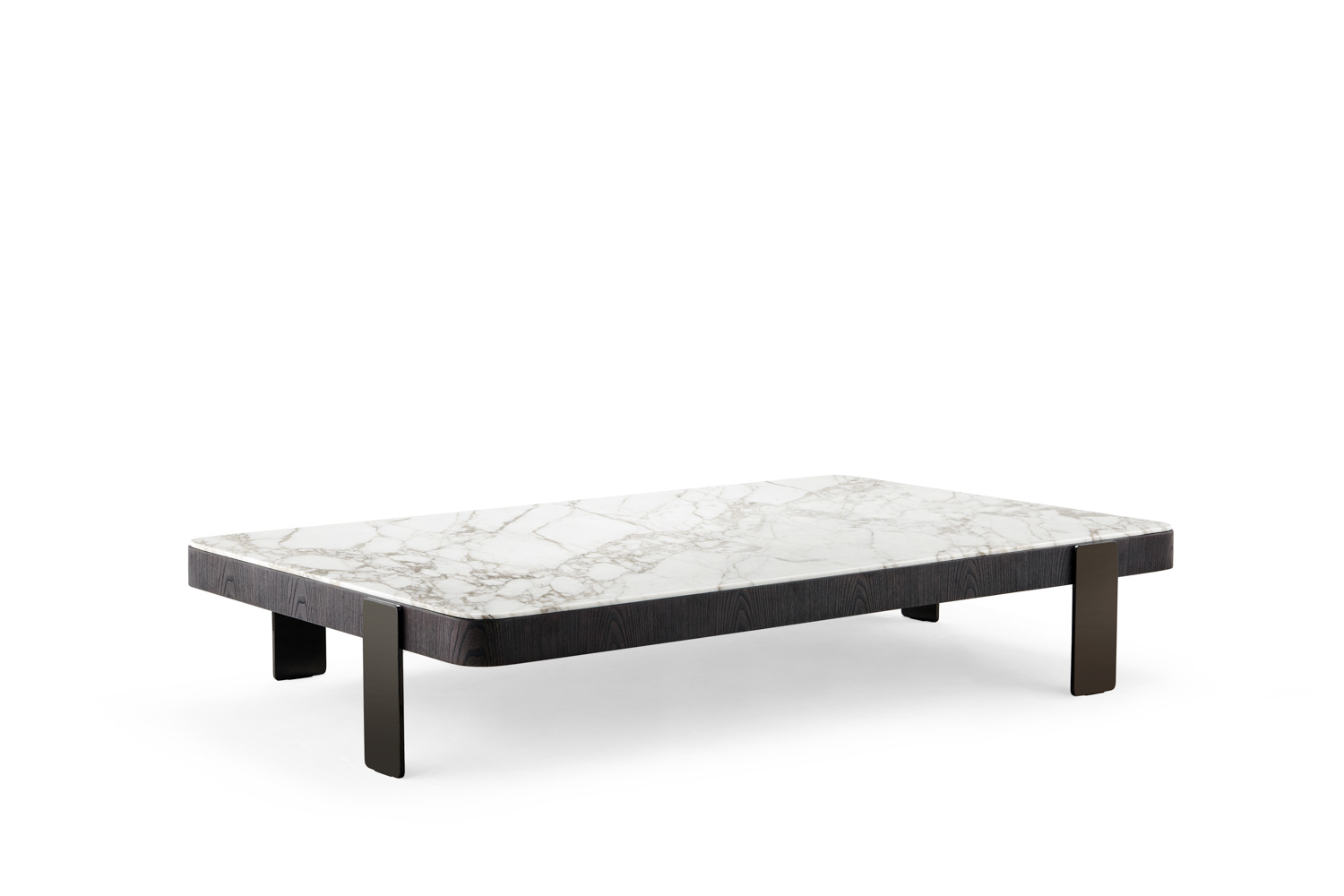 Rectangular center table with a light marble top featuring soft grey veining, framed by a dark wooden border. Supported by short, sturdy wooden legs, it blends natural elegance with minimalist structure.