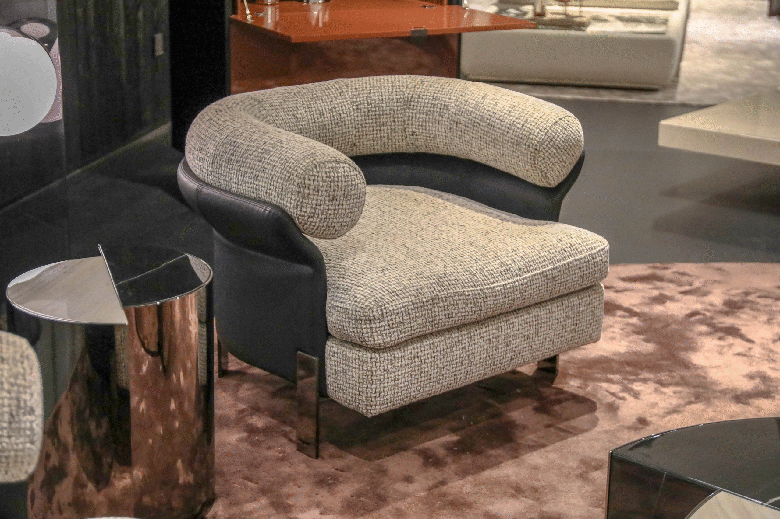 Contemporary leisure chair featuring a plush light fabric seat and backrest, paired with dark-toned accents along the armrests and outer shell for a bold contrast. Its sculpted form and layered cushioning offer both comfort and visual sophistication. Designed with a modern sensibility, this piece adds texture and character to refined living spaces.