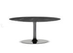 Dining table with a round marble top, polished and veined for a rich, elegant finish.