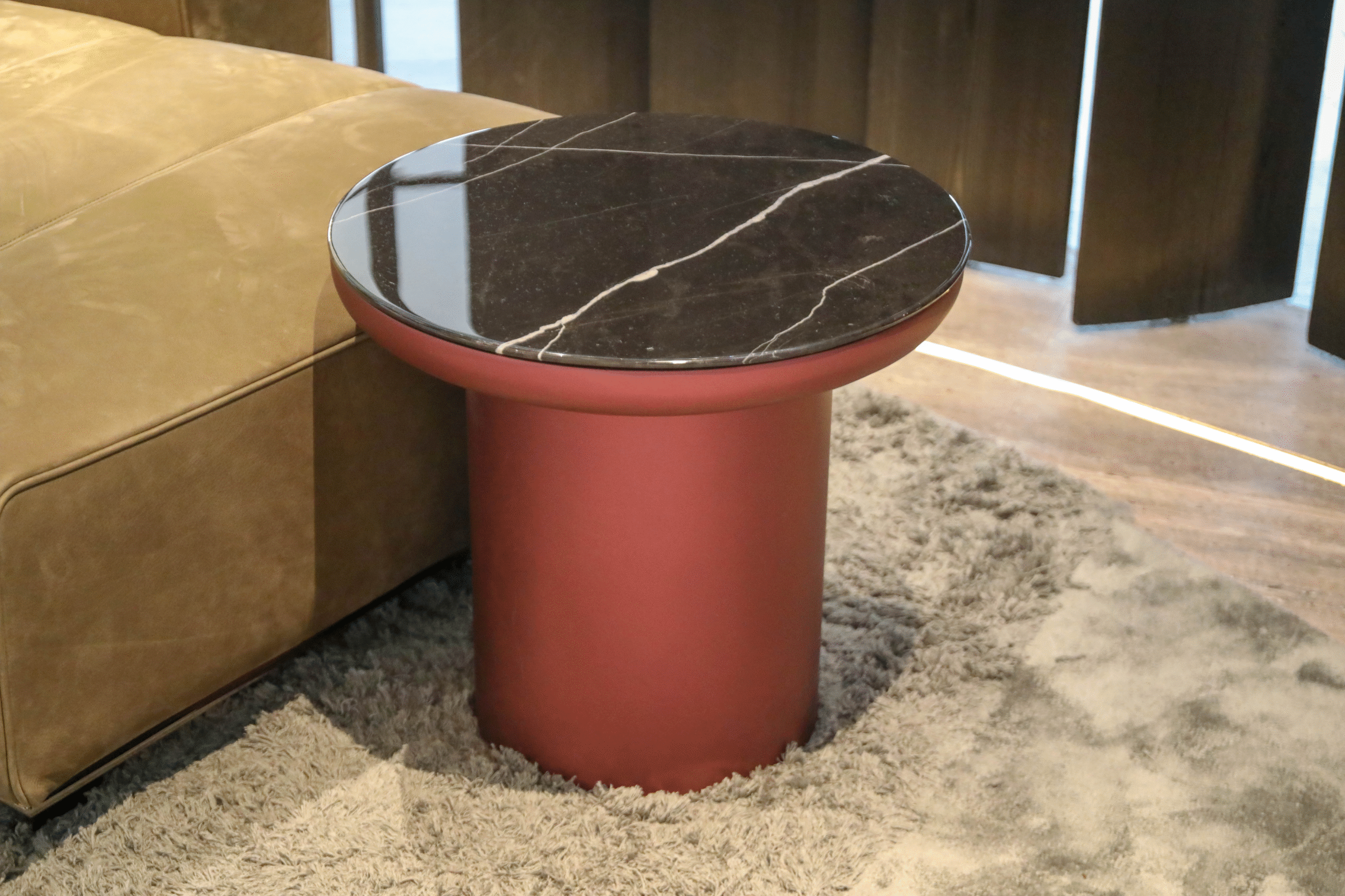 Round side table featuring a polished black marble top with natural white veining. Supported by a cylindrical lacquered wood base in deep terracotta red, offering a bold contrast and sculptural presence in modern interiors.