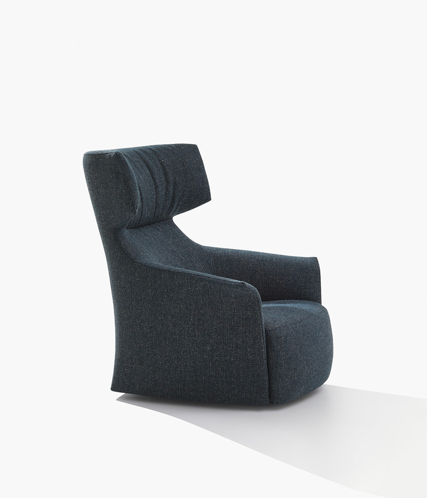 Sophisticated leisure chair with a high backrest and sculpted armrests, designed for comfort and visual impact. Upholstered in a smooth dark fabric, it features gentle curves and a generously cushioned seat that invites relaxation. The sleek silhouette rests on sturdy legs, making it a refined addition to modern lounges, reading corners, or executive spaces.