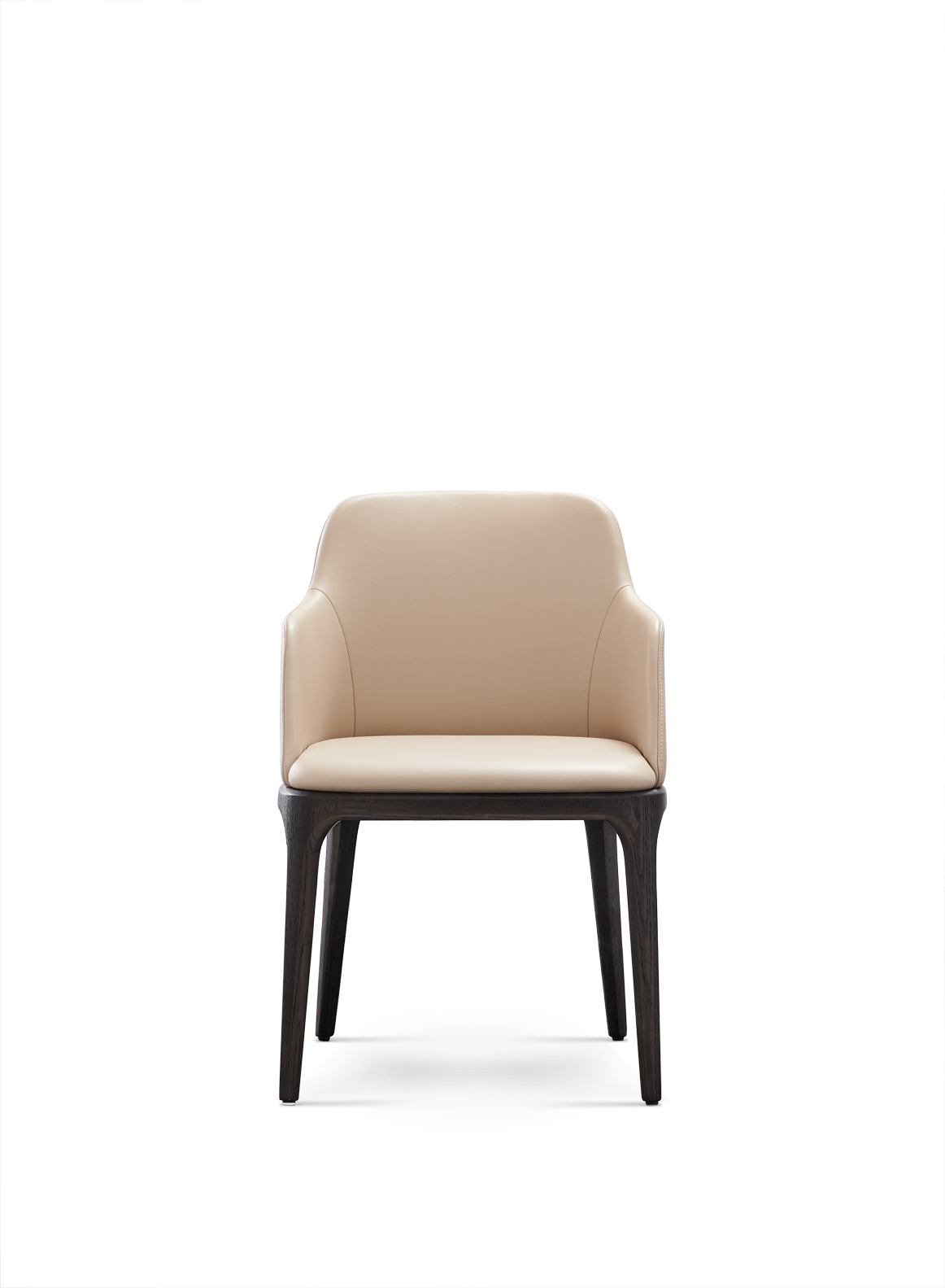 Compact dining chair upholstered in light beige fabric, offering a soft, neutral tone that complements modern interiors. The seat and backrest are gently padded for comfort, while the angled back enhances ergonomic support. Four tapered legs in dark wood provide sturdy grounding and a sleek visual contrast.