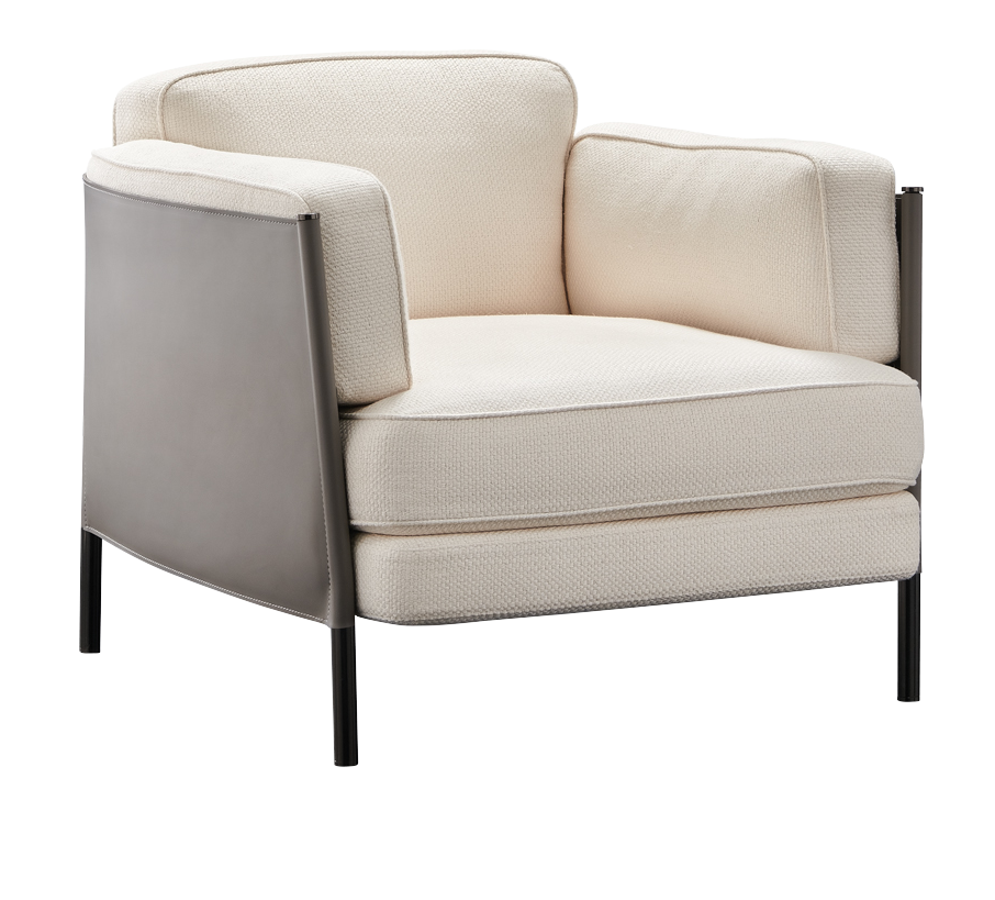 Minimalist armchair with light cream cushions and a dark-toned frame. The seat and backrest are softly padded, while the armrests feature a sleek leather-like trim for contrast and structure.