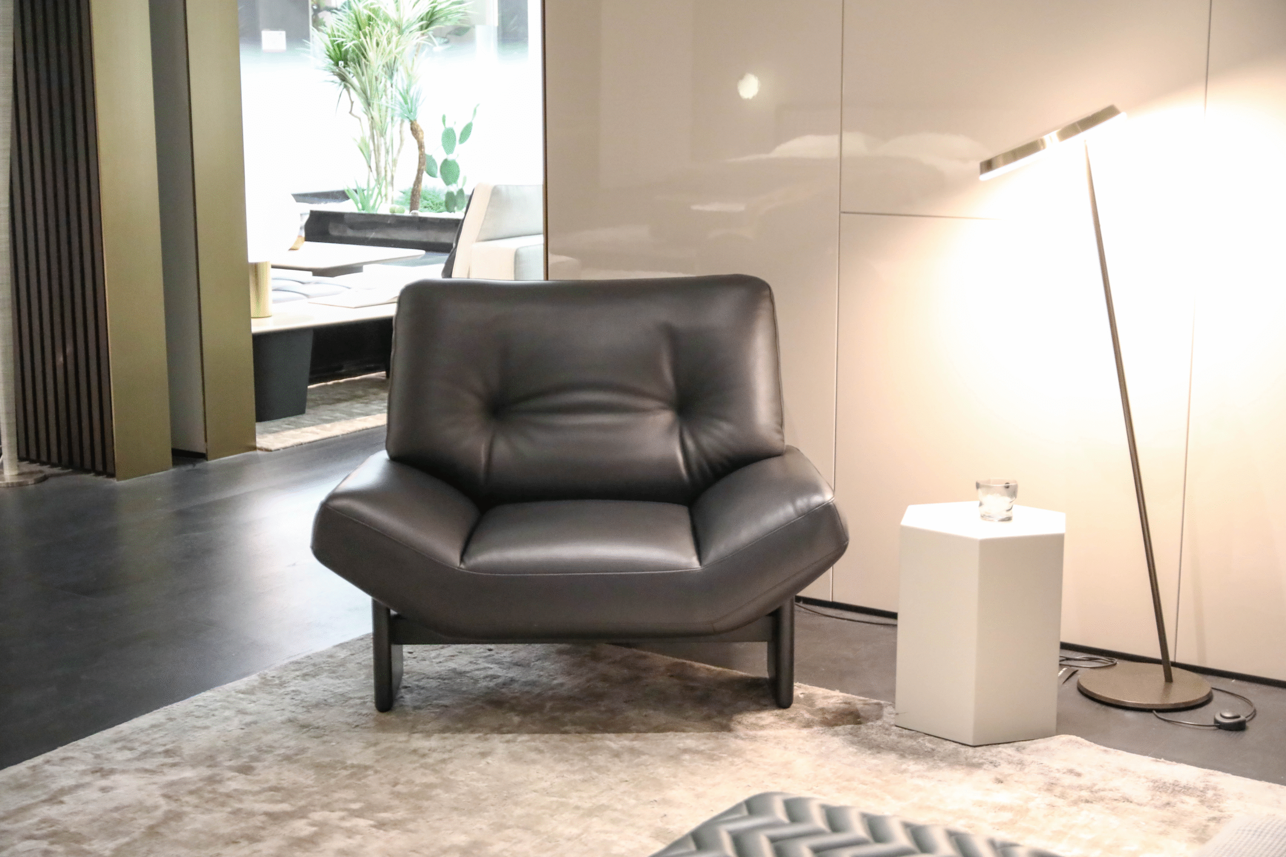 Angular leisure chair upholstered in soft grey fabric, offering a refined texture and understated elegance. The high backrest and sculpted armrests provide ergonomic comfort, while the geometric silhouette adds architectural interest. Supported by slim, dark metal legs, the chair blends relaxed seating with contemporary style—ideal for modern living rooms or lounge areas.