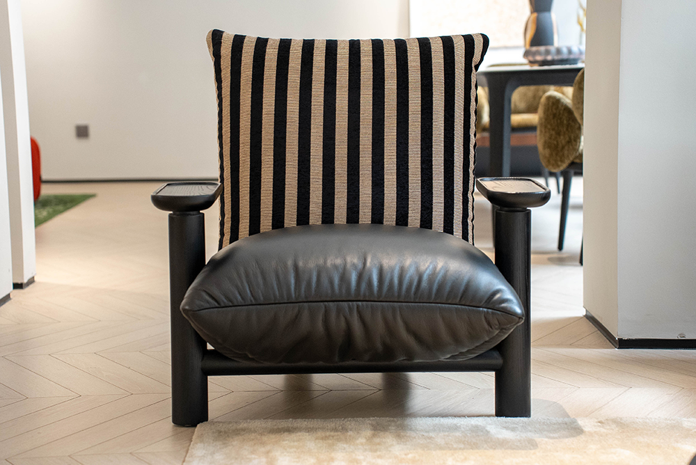 A stylish leisure chair showcasing a bold, vertically striped fabric in black and beige. Its plush, cushioned seat and supportive backrest invite relaxation, while the sleek wooden armrests and sturdy frame add a touch of modern elegance to any living space.
