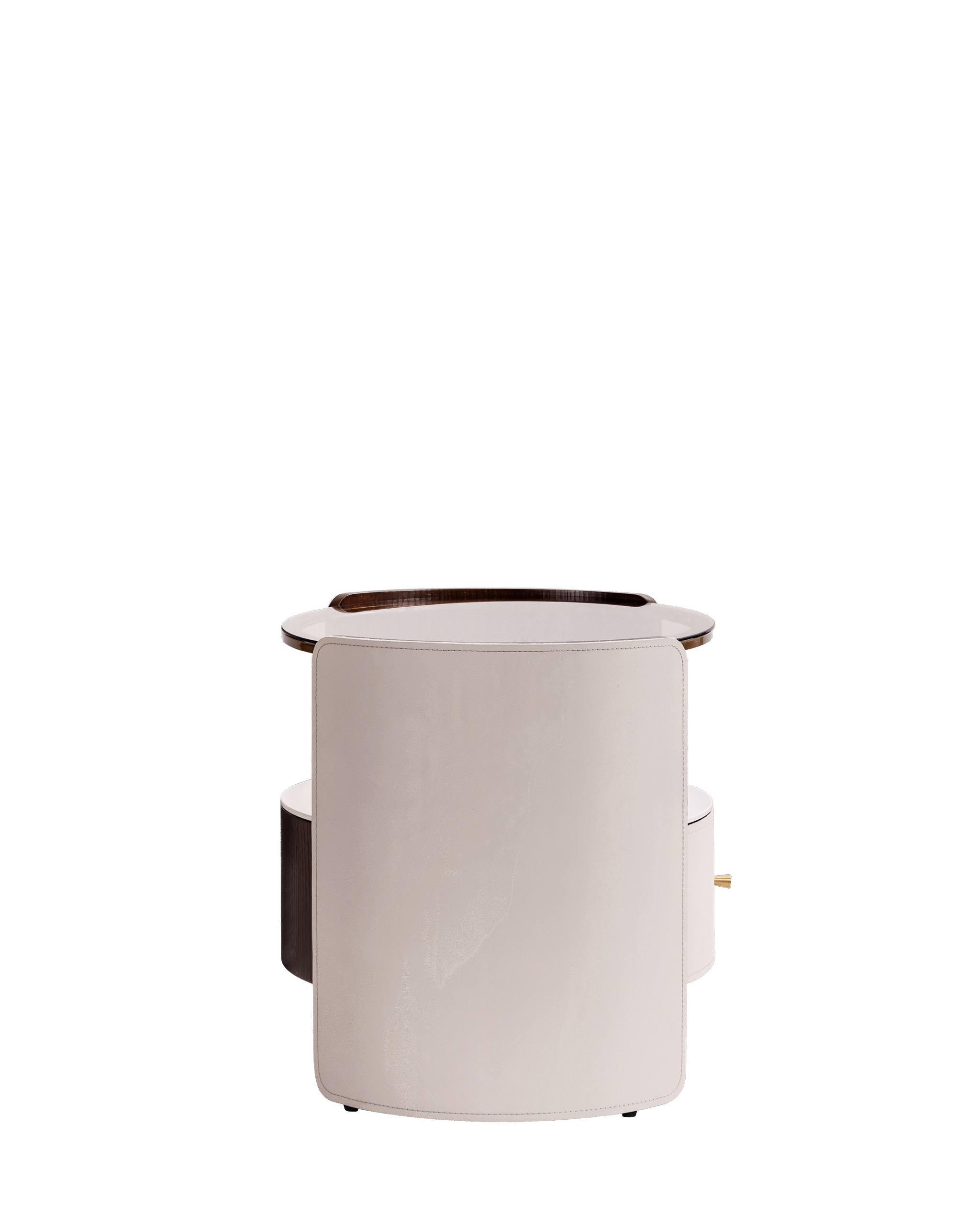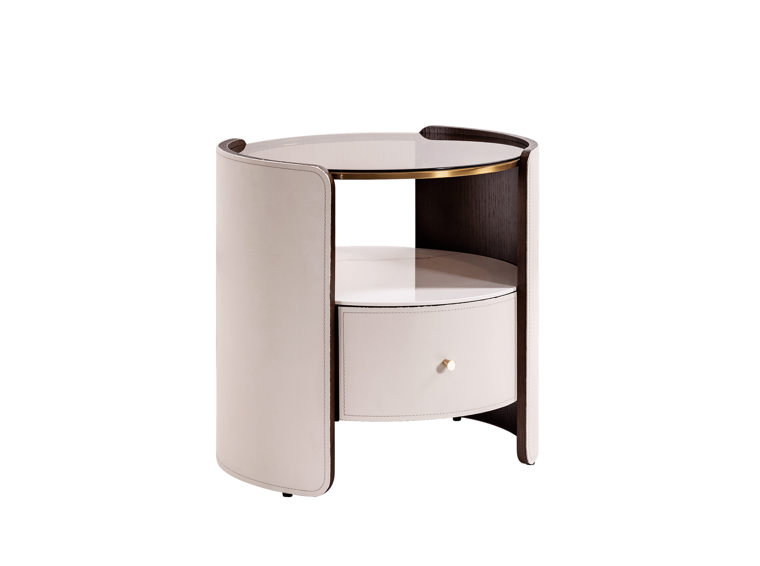 A stylish nightstand with a curved design featuring a glass tabletop, complemented by a sleek drawer with a gold handle and an open shelf for additional storage. Perfect for a modern bedroom setting.